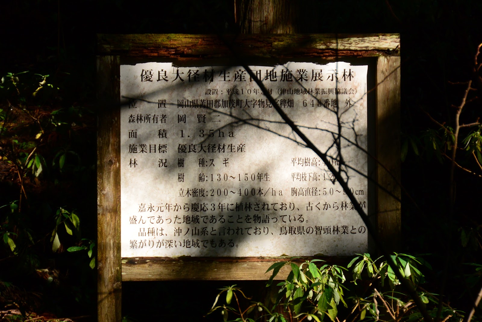 立派な杉林を登と奥に右手奥に看板が見えた。寄ってみると智頭林業の流れで、大径材の展示林表示だった。なるほど立派な杉林です。
