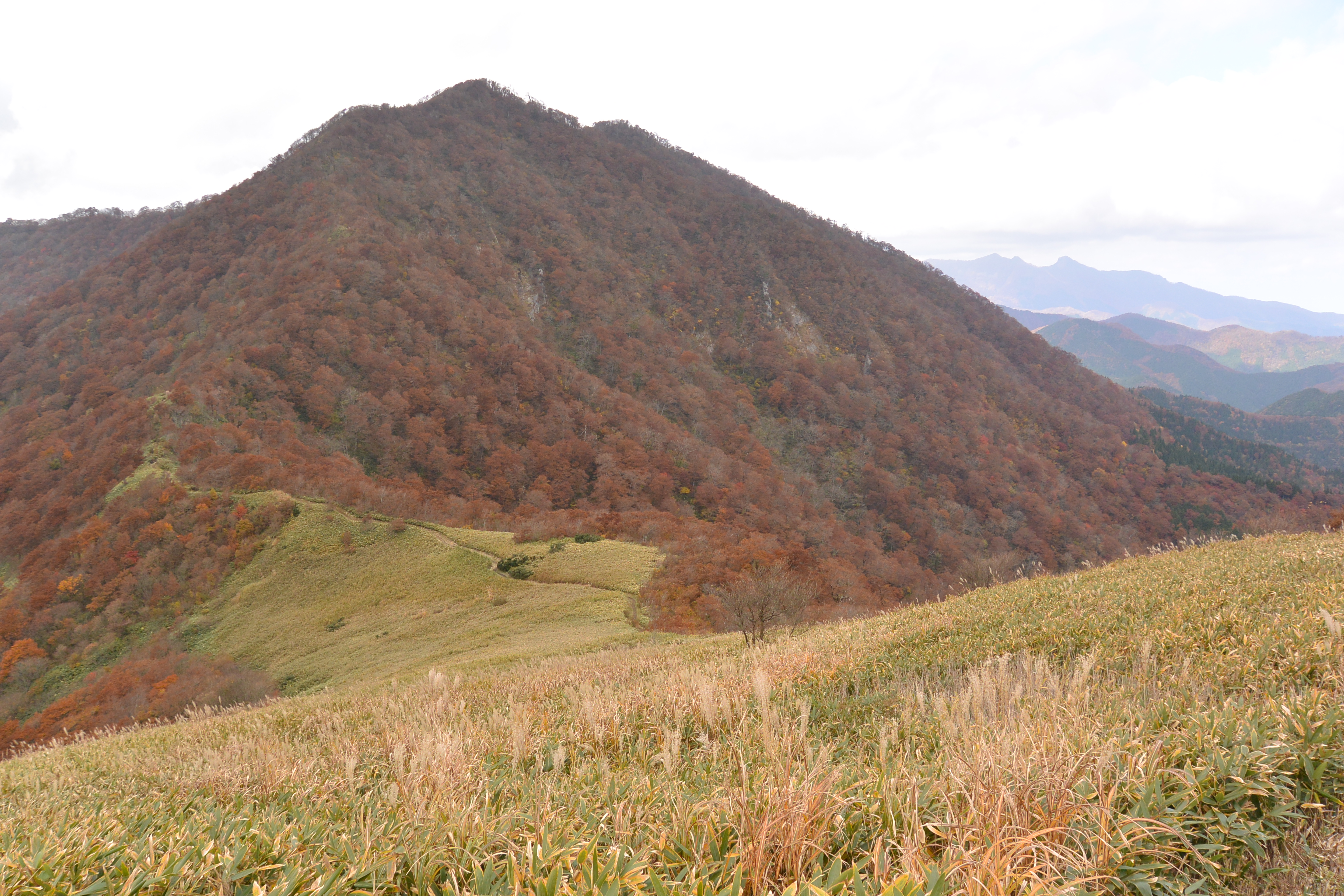 縦走路最低部のフングリ乢へ下る道も整備が進み快適だ。途中のブナもきれいに黄葉している。リンドウが最後の頑張りを見せ蕾を開き始めている。中蒜登りの山腹もなかなかよろしい景色です・・・(@_@)‼ がしかし、300mの登りはなかなかしんどい😣