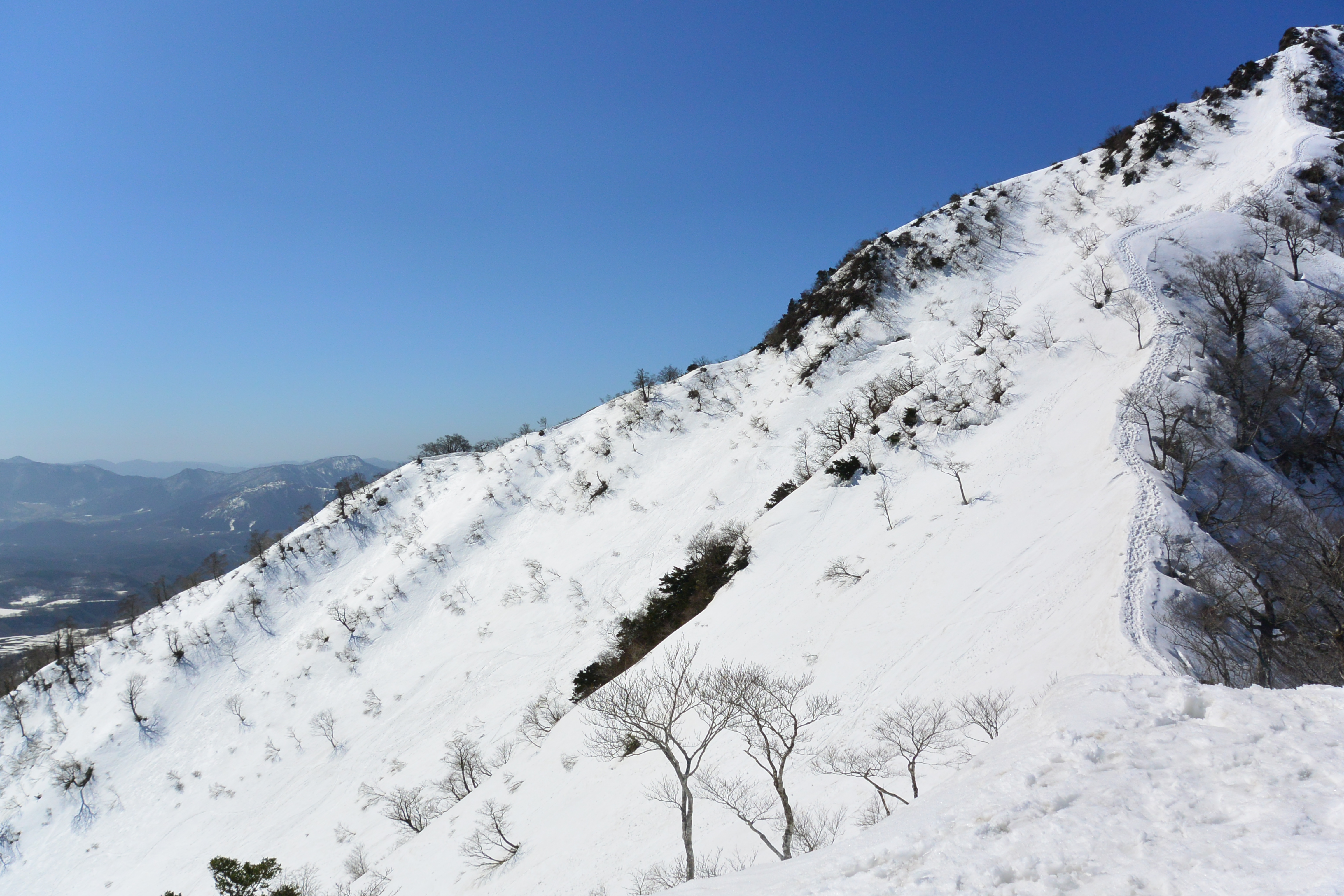 いつもの大ブナまで下って昼休憩を伺いますが、若干風が強く寒いので、南側の夏道登山道の尾根にトラバース。少し下った陽当たりの良い風裏で昼食にします。